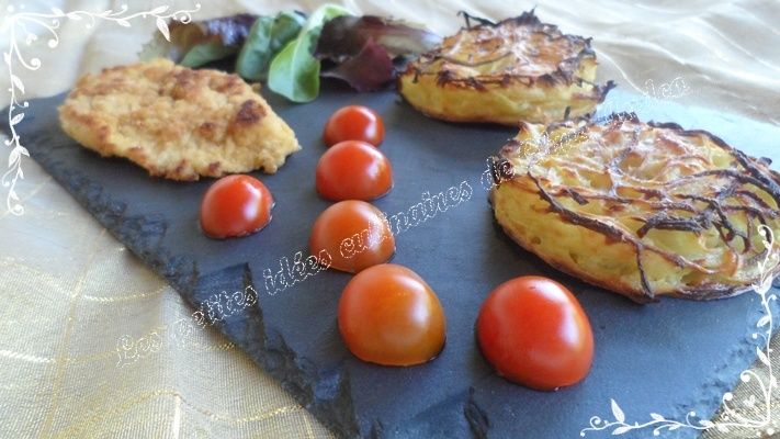 Je vous invite à déguster mon plat complet composé de röstis de pommes de terre et d’escalopes de poulet panées.