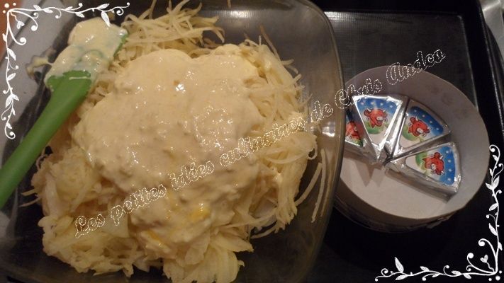 - Ajouter les pommes de terre et l’oignon râpés au mélange précédent et verser ensuite sur une plaque recouverte de papier sulfurisé ou un flexipan avec un emporte pièce.