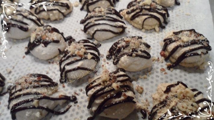 7- Faire fondre le chocolat et le répartir sur les meringues puis ajouter les éclats de noisettes.